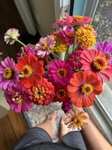 The leaves are starting to take a turn toward their fall colors here in Ohio, but I’m still gathering zinnias in my garden. The tree